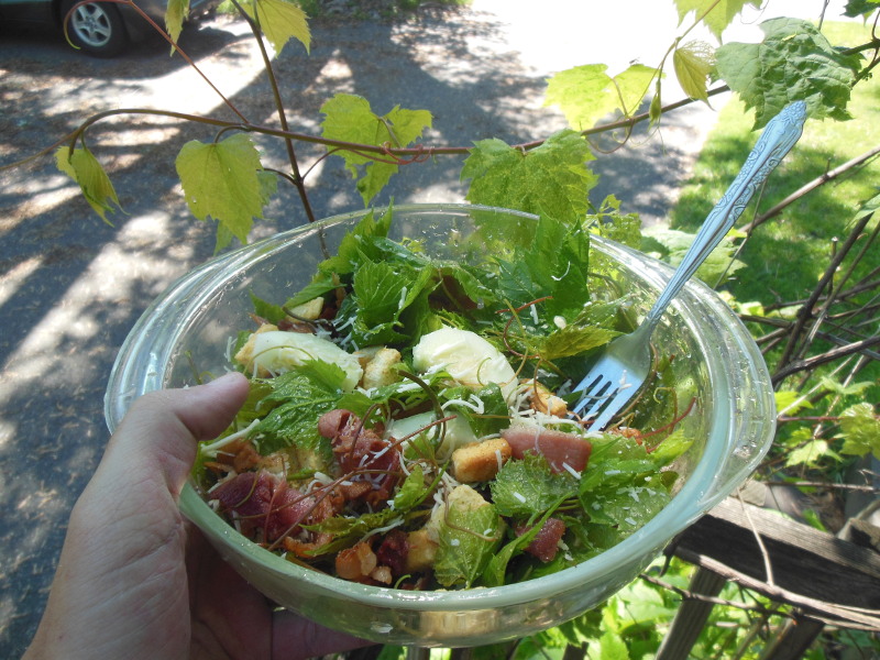 The wild grape (river grape) plants I grow for privacy and to graft table grapes onto were getting a bit overgrown and too close to the outdoor lights this spring. I decided to make a nice salad with the tender baby grape leaves and sour vine tendrils from the vines I cut down. It turned out absolutely delicious with some bacon, cucumber, cheese, crutons, and balsamic dressing.