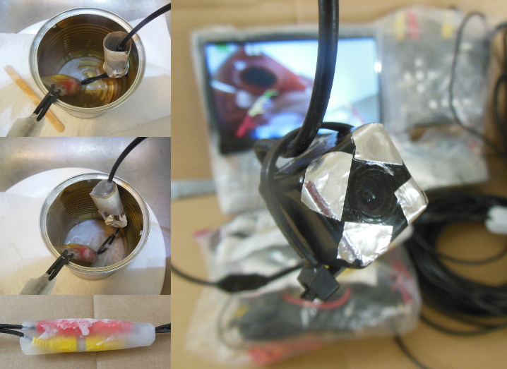 The waterproofing was the interesting part, otherwise it was just all plug and play with power and RCA cables. My first step was removing all screw holes from the camera by filling with baking soda + super glue. I then sprayed silicone conformal coating over the plugged camera multiple times over three days. For the RCA connections in the extension cord I also did one spray of silicone conformal coating but most of the water proofing comes from melting paraffin wax and casting it as blocks around the standard RCA plugs. To do this I cut up some cardboard tubes and used them as molds around the plugs/cable. This was very janky looking but it worked for many hours down 15ft underwater. I recommend paraffin wax as it's easy to use and remove: unlike, say, hot glue or epoxy.